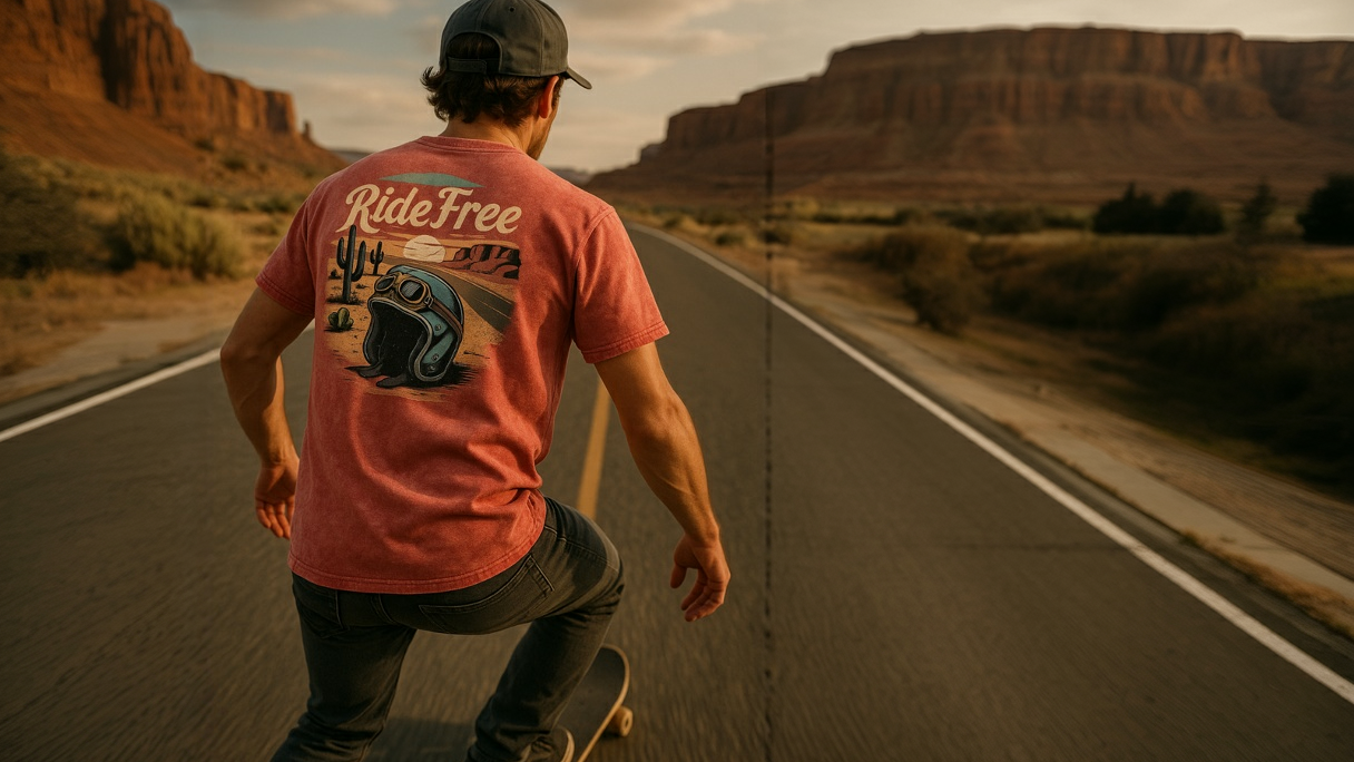 Vintage denim T-shirts with a biker and nomad style. Double-sided designs inspired by freedom, wide open spaces, and the wild spirit.
